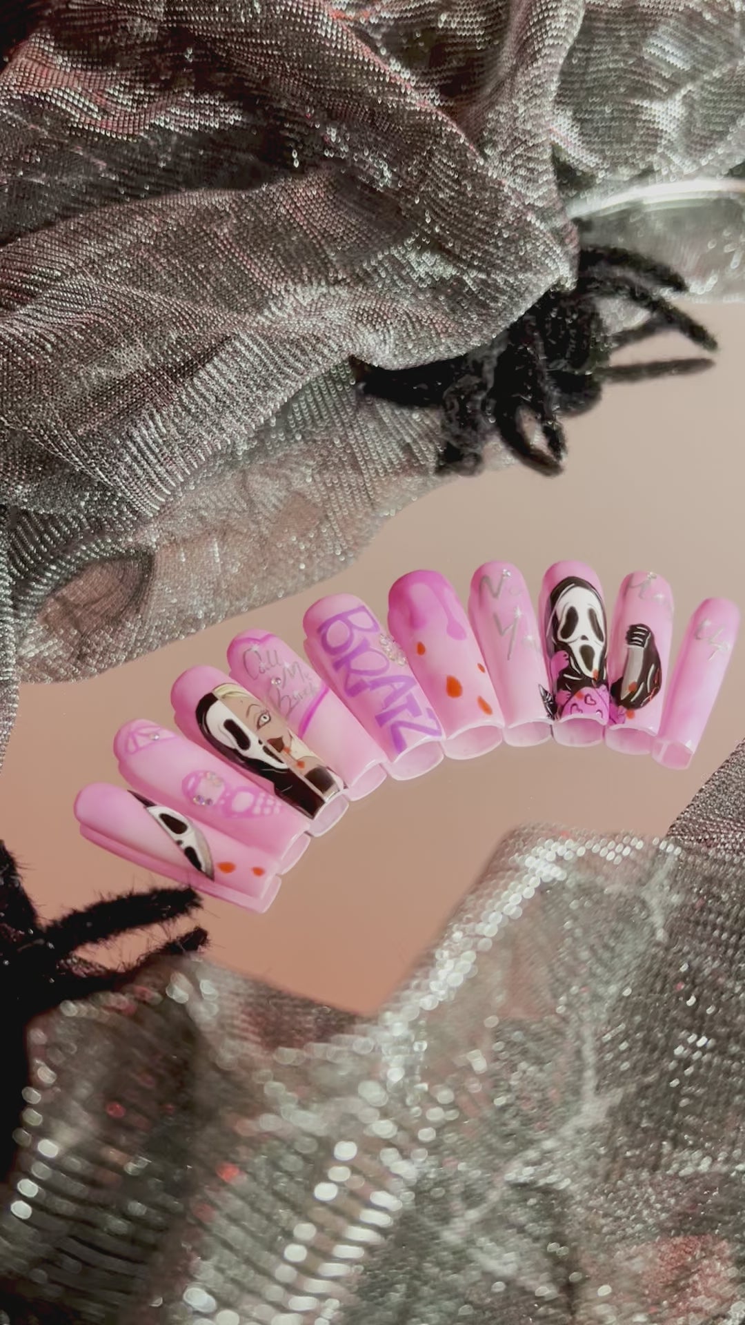 I’ll Kill You Pt.3 is a ready to ship set in our Halloween 2022 Collection! Our third Scream design for Halloween and this year it’s featuring Bratz. 100% hand painted and elevated with rhinestones